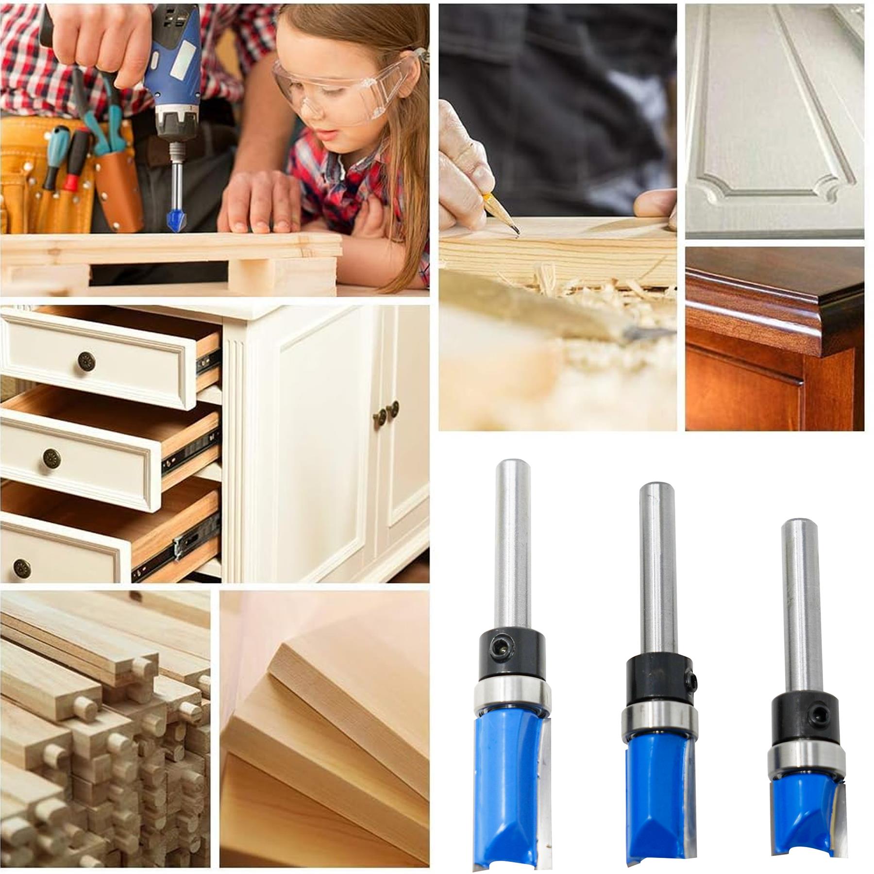 - VERSATILE 3-PIECE SET – Includes three flush trim router bits, for trimming, milling, and shaping wood, plywood, MDF, and laminates.