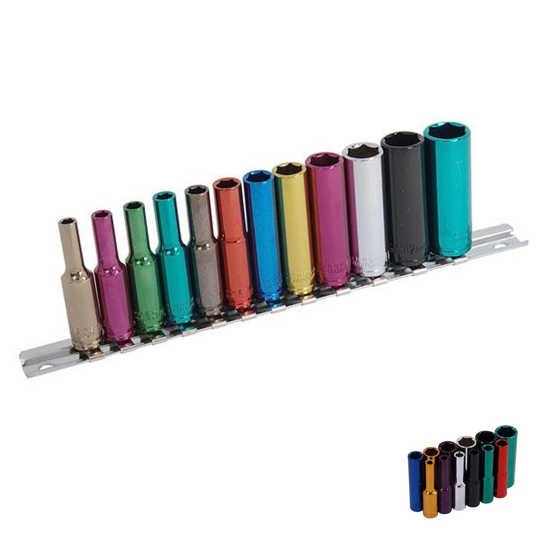 12 Piece 1/4 Inch Drive Multi Coloured Deep Socket Set Plus Rail Workshop Tools By Dapetz
